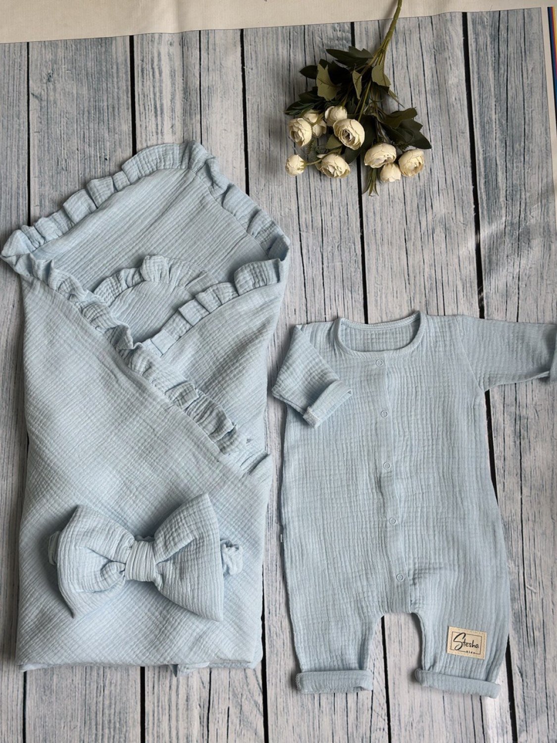 Теги: Купить детские конверты, комбинезон оптом, детские конверты на выписку оптом. 335-Г. Комплект из детского комбинезона, р 56 и конверта муслин, хлопок 100% 90/90 см, голубой цена,отзывы официальный сайт "Стеша Кызыл"