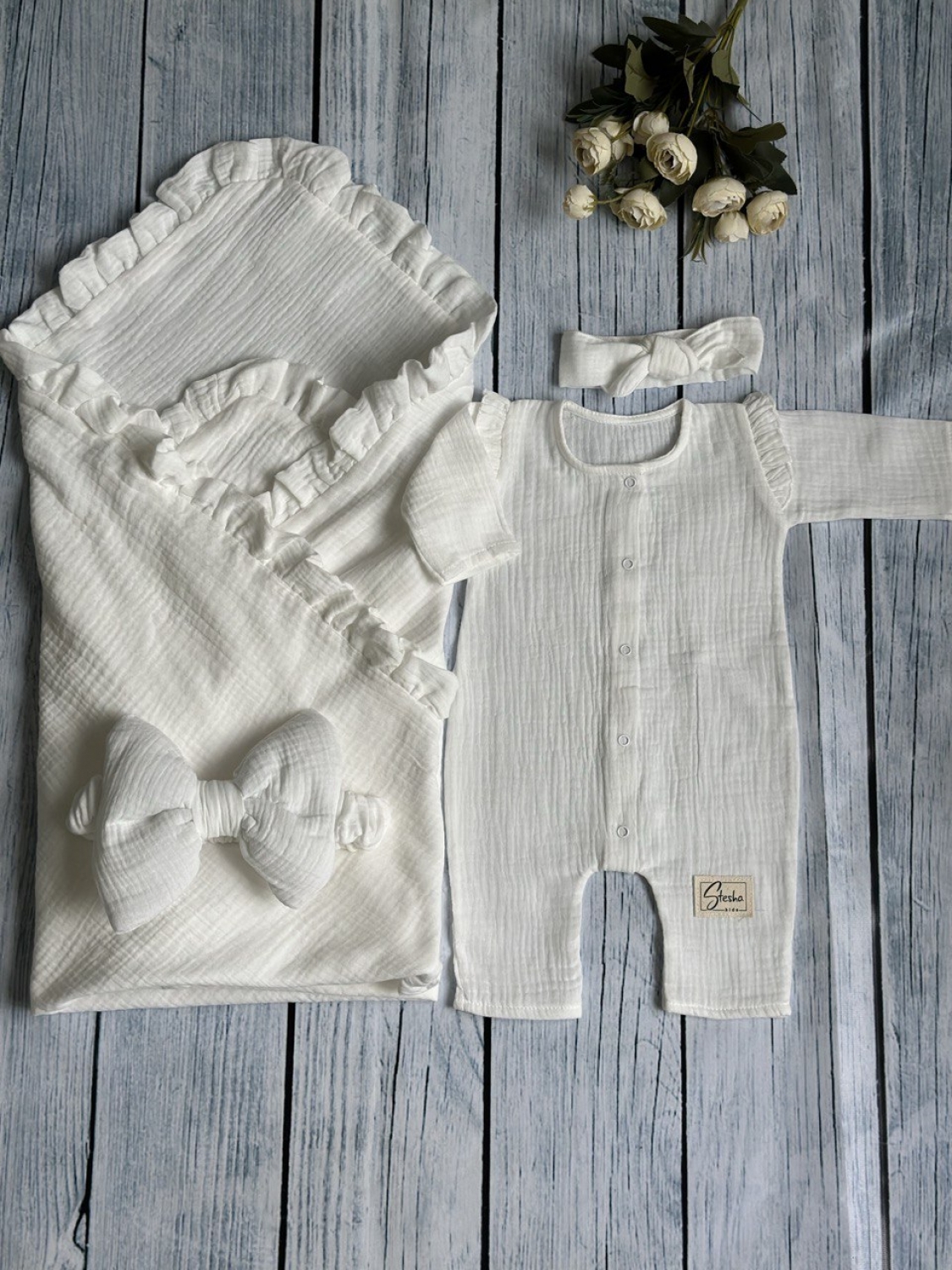 Теги: Купить детские конверты, комбинезон оптом, детские конверты на выписку оптом. 335-М. Комплект из детского комбинезона, р 56 и конверта муслин, хлопок 100% 90/90 см, молочный цена,отзывы официальный сайт "Стеша Кызыл"
