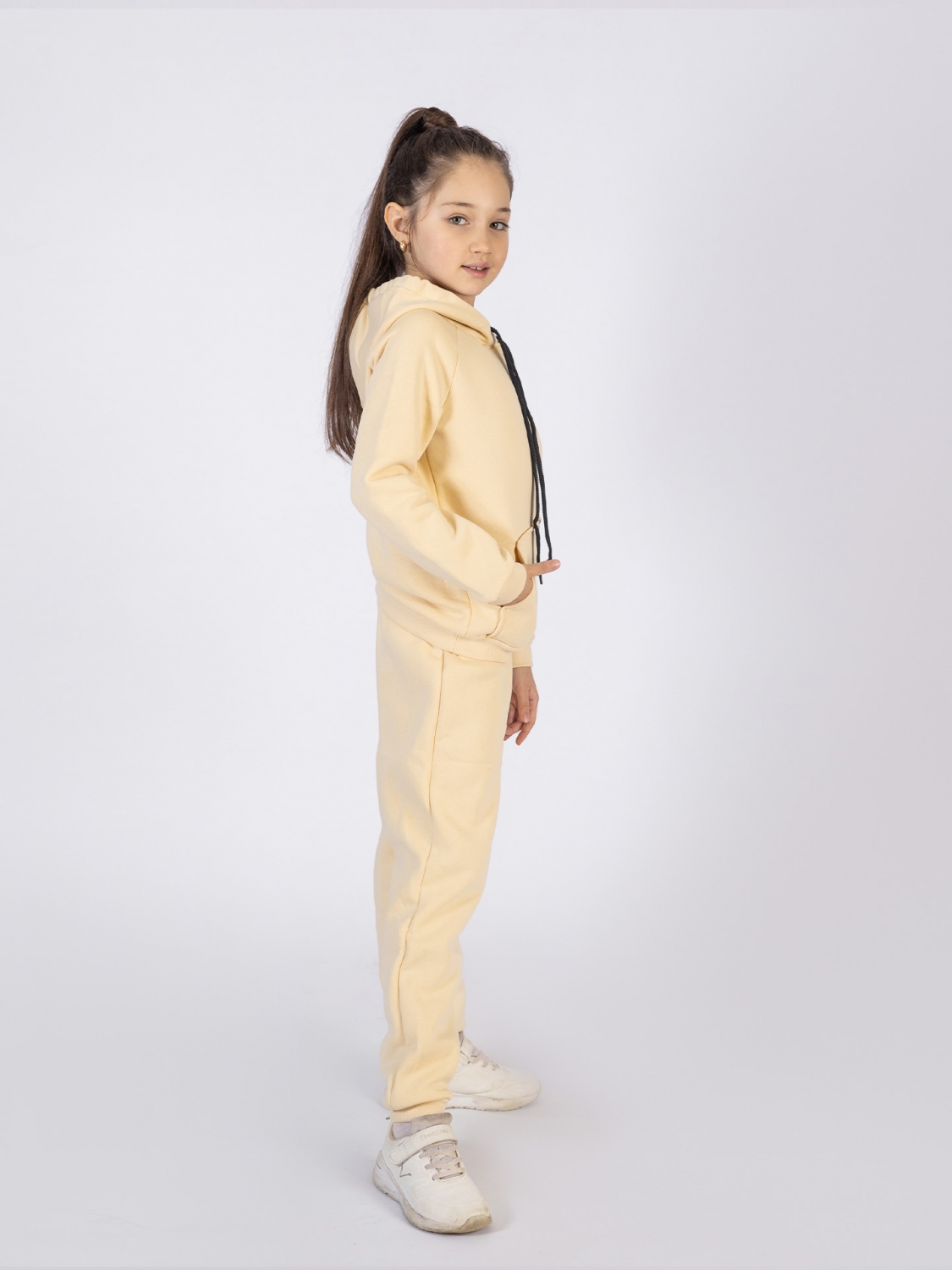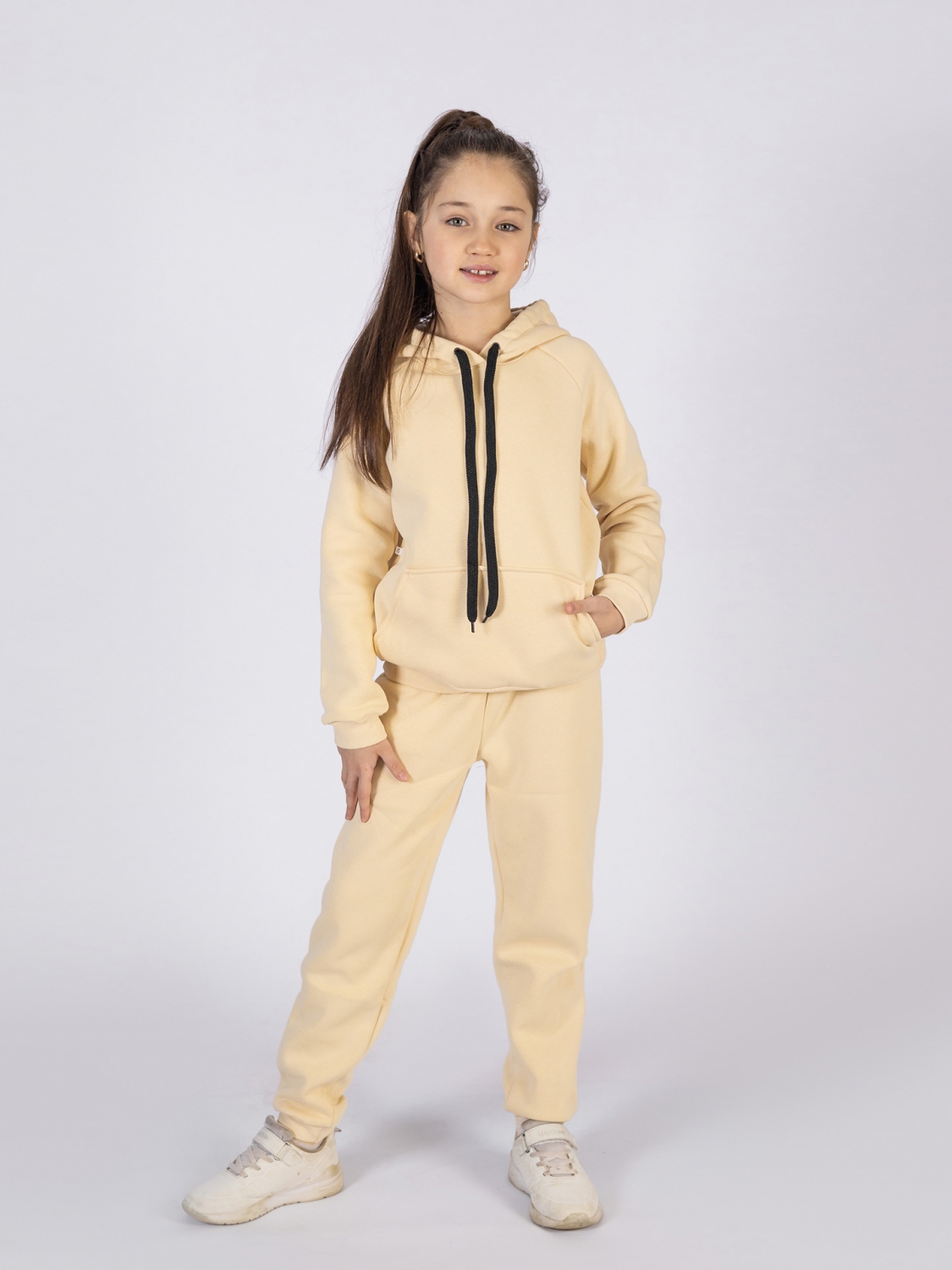 Купить оптом 296-СЛ. Свитшот с капюшоном + Штаны, хлопок 65%, 35% ПЭ, 3-х нитка (начес) сливочный 122,128,134,140 в Кызыле